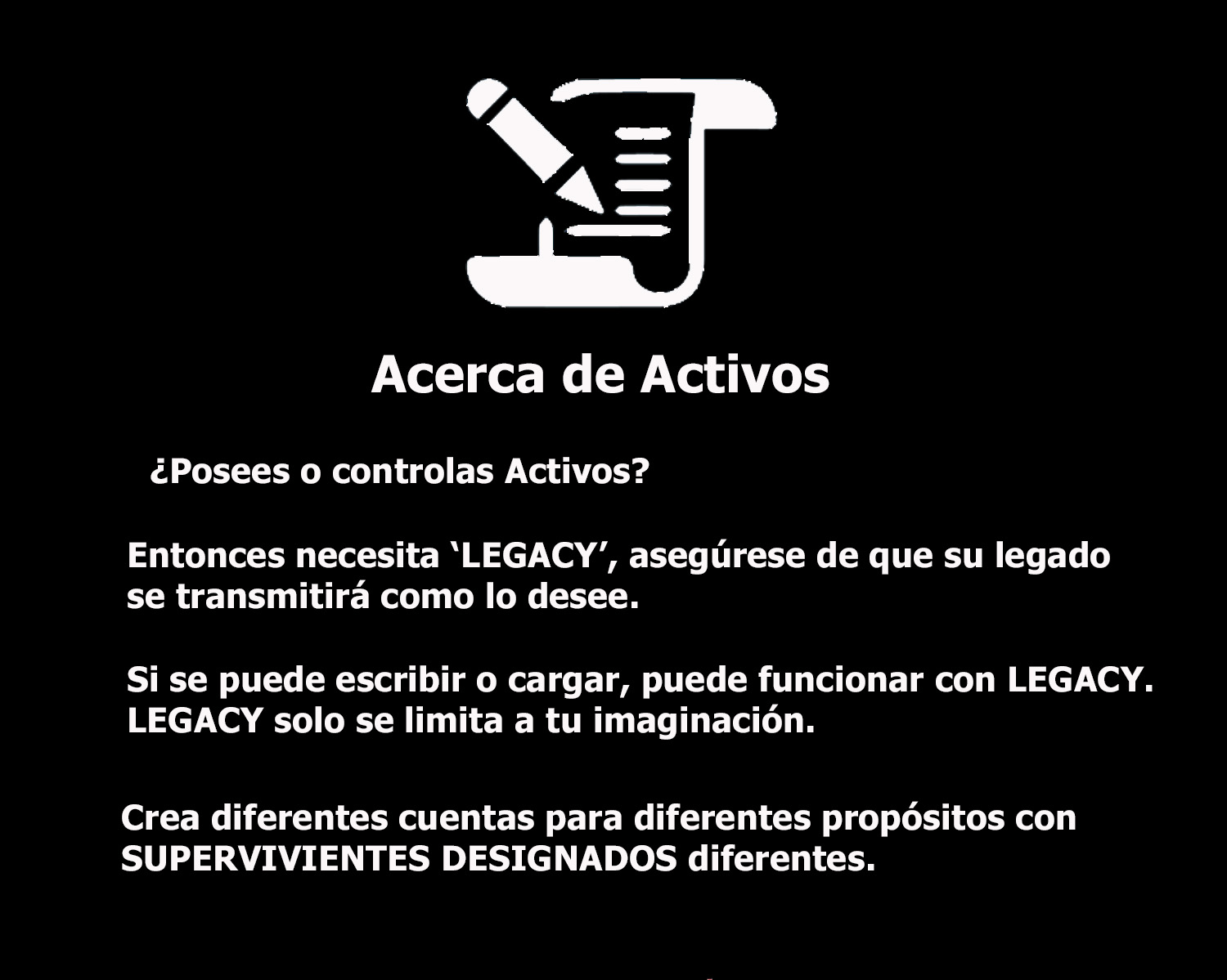 Legacy es una herramienta para ayudar a sus beneficiarios, herederos y legados a localizar todos sus activos cuando es necesario. Los activos que tiene pueden cambiar rápidamente y es posible que posea activos que nadie conozca, ahora puede contar con ellos manteniendo su privacidad. Demasiadas personas fallecen y quedan sus activos sin reclamar... póngale final a ello o al menos reduzca las pérdidas invirtiendo tiempo en listar sus activos y cuando llegue el momento apropiado, Legacy enviará todos los archivos y documentos a su sobreviviente designado.